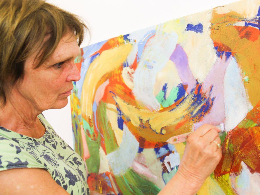 Sie setzt eine geschwungene Linie, ich antworte darauf, mal ergänzend, dann mal einen Kontrapunkt setzend. Die Farben verdichten sich, die Rhythmen und Formen lassen Schwingung entstehen. Die Farben dominieren immer mehr die Leinwand, sprechen meine Gefühle an, innere Lebendigkeit, ja fast Euphorie entsteht. Kein Weiß darf mehr zu sehen sein — oh ich verliere mich in der Farbenwelt!