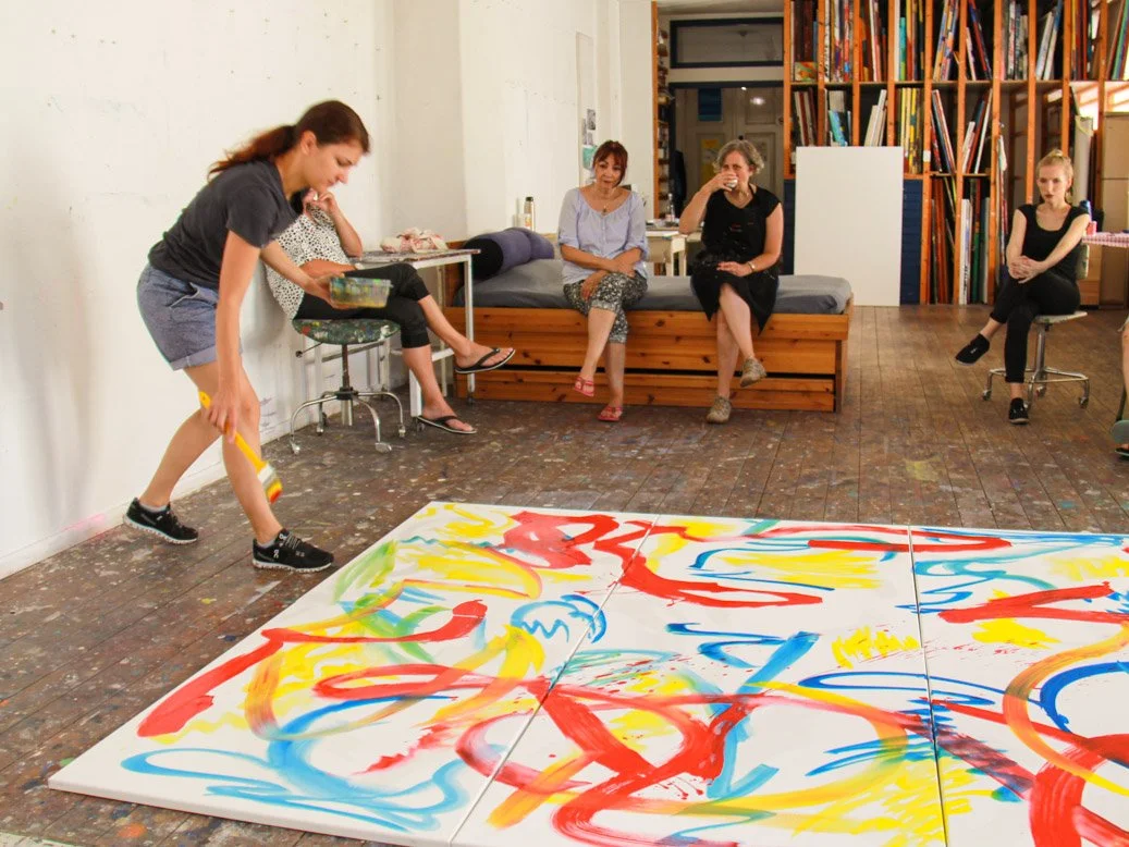 Im hellen Sonntagvormittagslicht treffen sich 7 Frauen um eine grosse weisse Fläche mit Farben zu bearbeiten. Blau Gelb Rot Es ist ganz einfach, das Wasser bahnt Gefühlsneutral den Weg. Zögernd, vorsichtig , zuerst grosse Linien und freie Schwünge, die von hier nach da wollen.