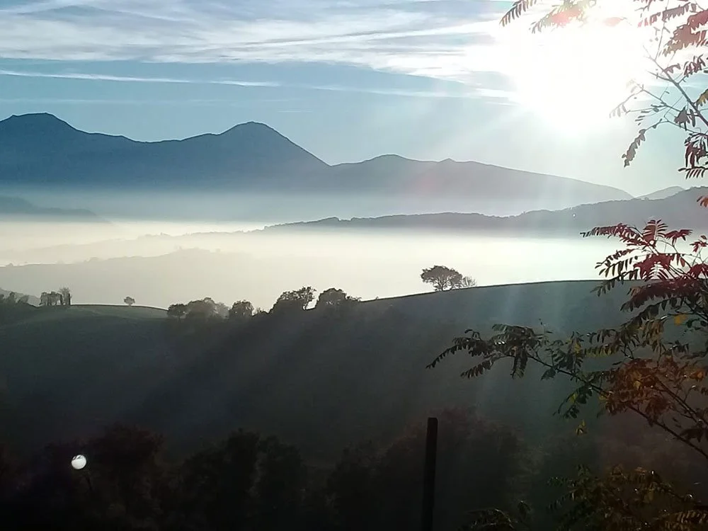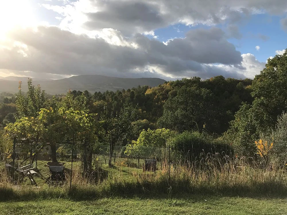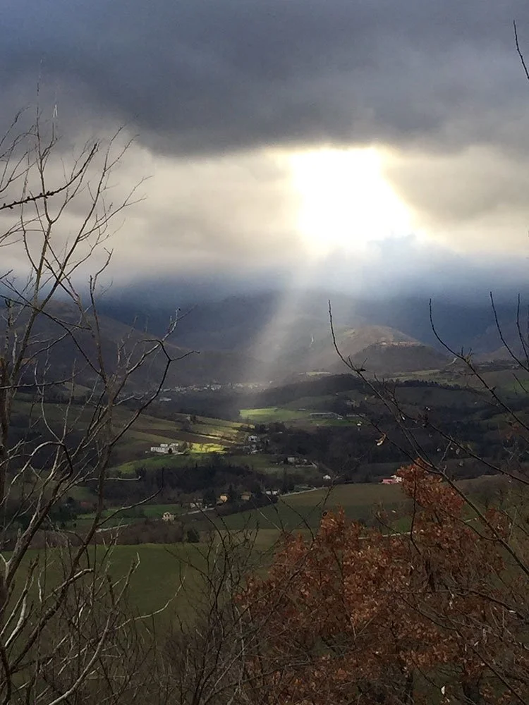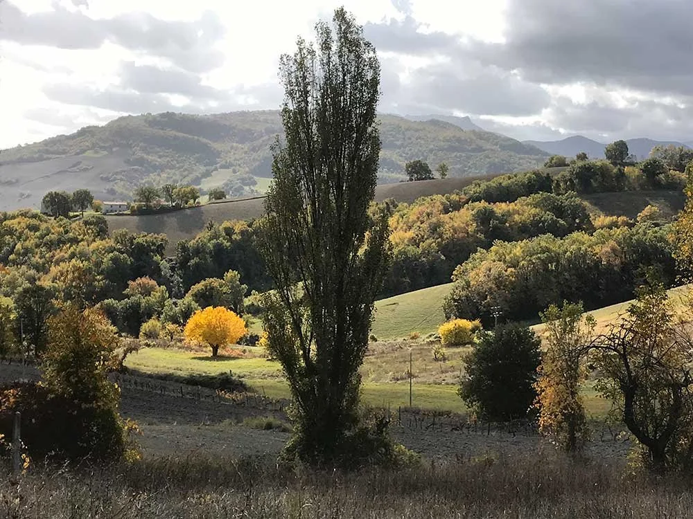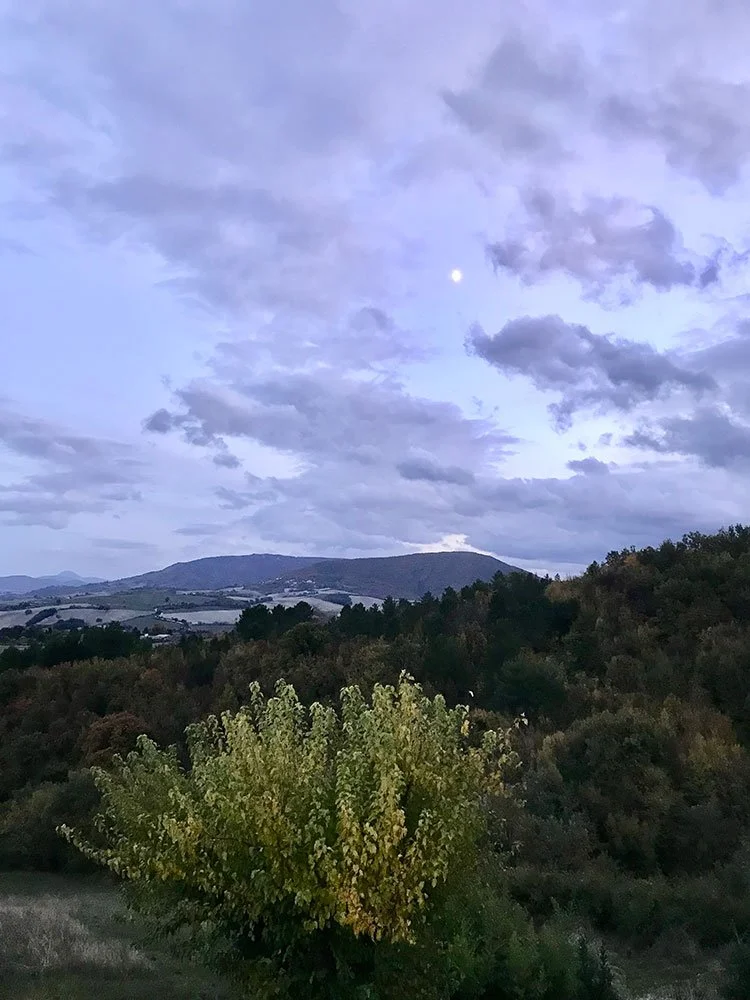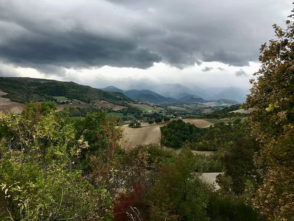 Im sanften Hügelmeer zeigen die Felder die bearbeitete Erde,